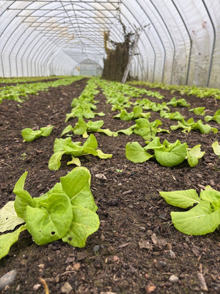 – Her har vi spinat og salat, som klarer seg gjennom vinteren. Da kan vi holde produksjonen oppe uten bruk av oppvarming, selv om det blir litt minusgrader, sier Romer Iversen, og lar oss smake på frisk og grønn feltsalat, som han dyrker i store mengder.