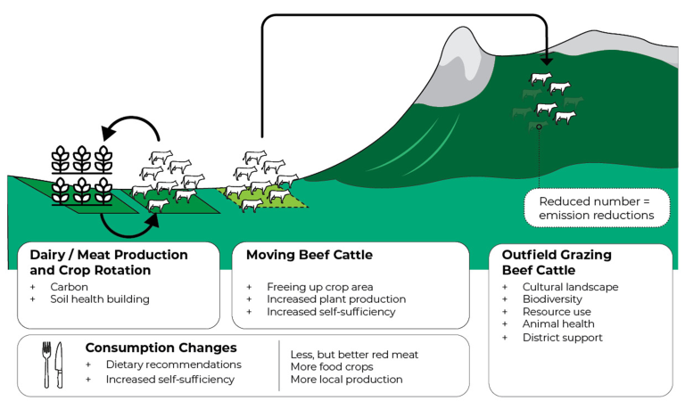 Omstilling kan videre bidra til målene om økt ressursutnyttelse, bedre dyrehelse, styrket små og diversifisert jordbruk over hele landet, og de kulturelle og biomangfolds verdiene beitelandskap kan ha, ved å flytte ammeku produksjon til marginale områder. Dette kan i tillegg frigjøre mat-areal til økt planteproduksjon og bidra til økt selvforsyningsgrad (van Oort et al., 2024). Endring i subsidier fra produksjonsrettet mot landskap, miljø- og klimaverdier kan videre kompensere bonden økonomisk for frafallet av antall dyr, og føre til riktig prising av kjøtt også i salgsleddet, som igjen kan støtte forbruksendringer.